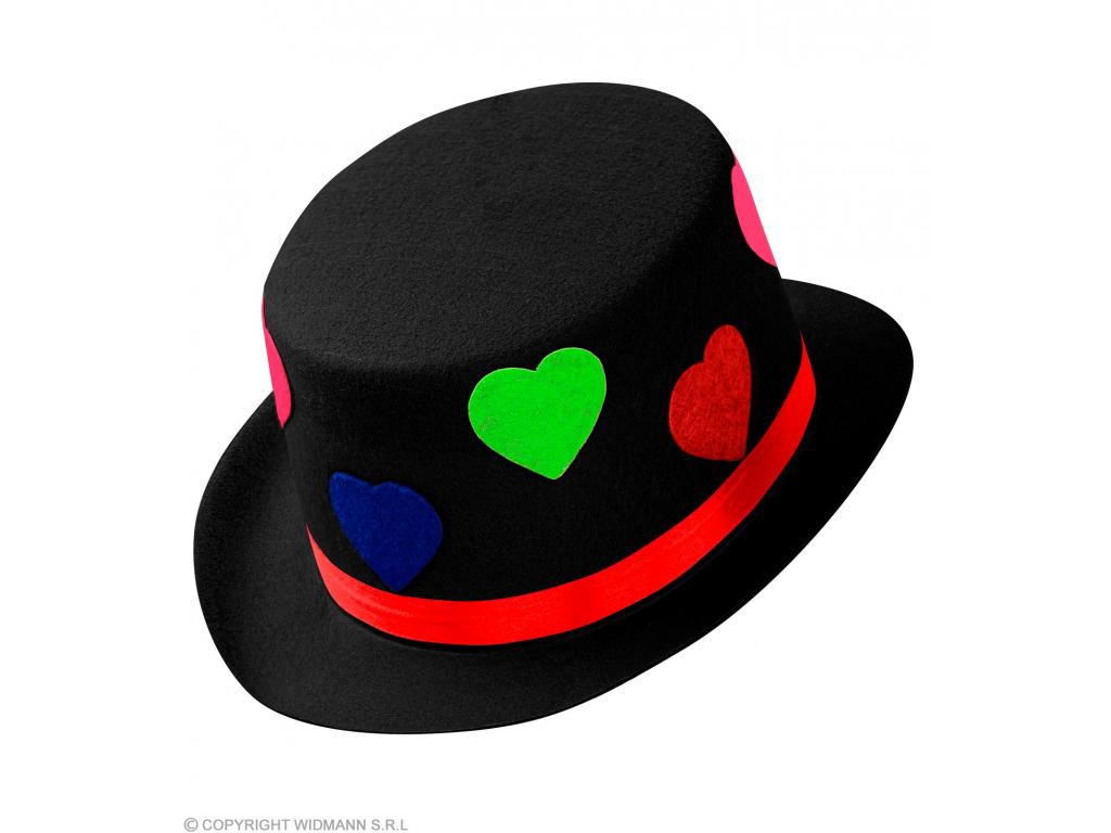 A Cilinder fekete szívekkel filcből leírása: Filc anyagú, fekete kalap szalaggal és szív mintával.